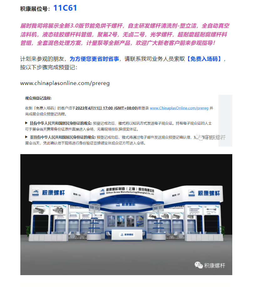 積康螺桿2023雅式(CHINAPLAS) 展位號(hào)11C61,歡迎新老朋友蒞臨參觀!